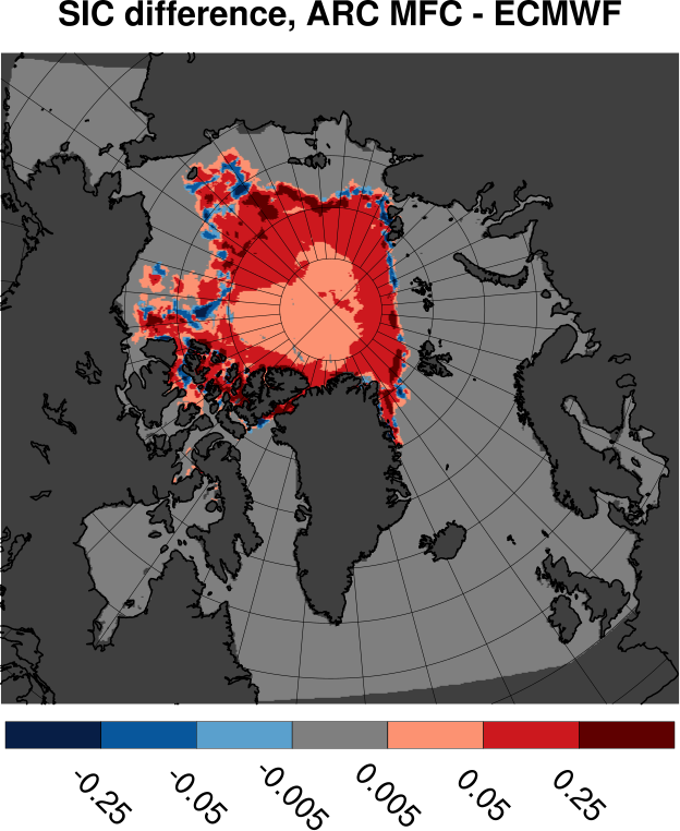 Tabulated values are computed by subtracting ECMWF results from ARC MFC results. All values are in units of Mkm2. Bottom row shows results for differences in sea ice area. Other rows shows area where the sea ice concentration differences fall inside the range given by the span in the leftmost column.