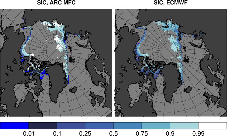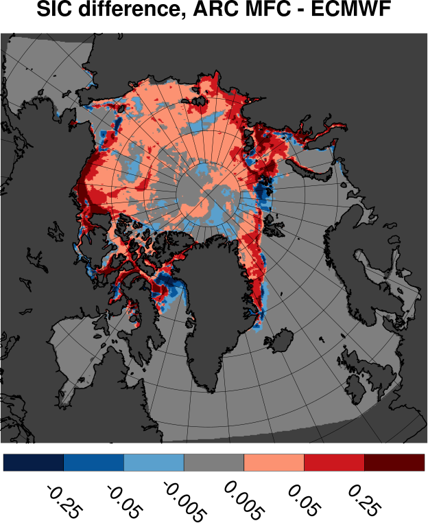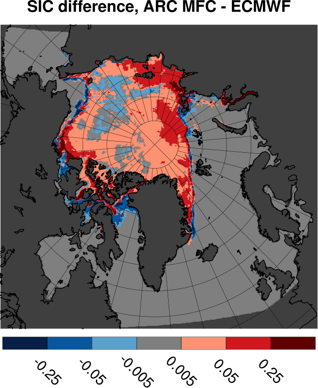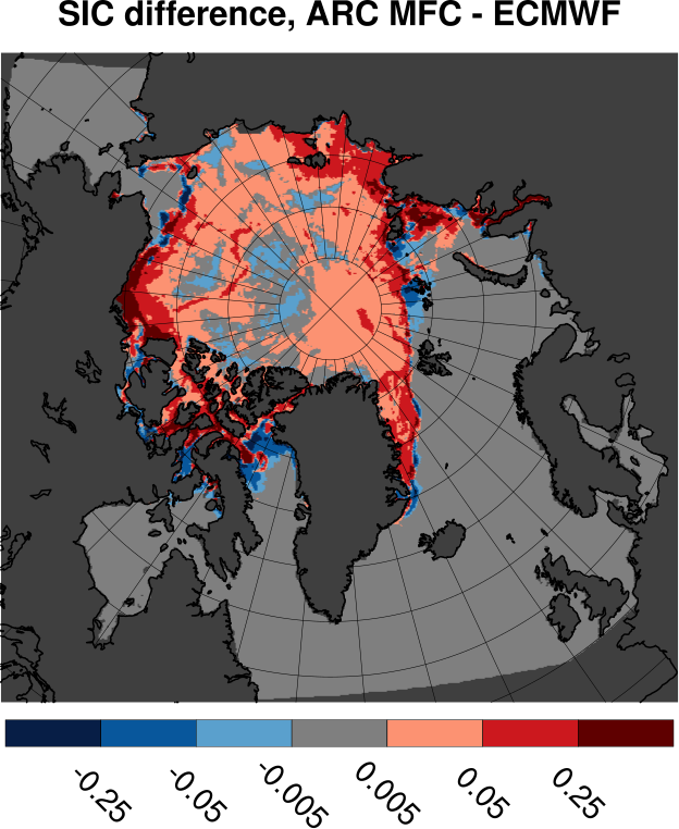Tabulated values are computed by subtracting ECMWF results from ARC MFC results. All values are in units of Mkm2. Bottom row shows results for differences in sea ice area. Other rows shows area where the sea ice concentration differences fall inside the range given by the span in the leftmost column.