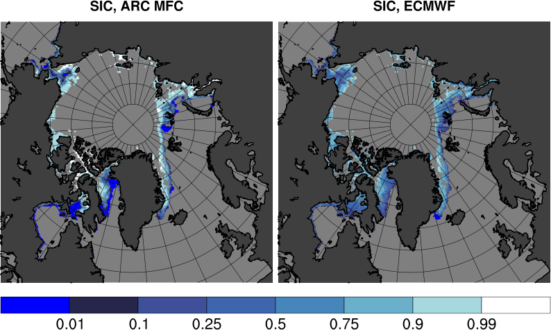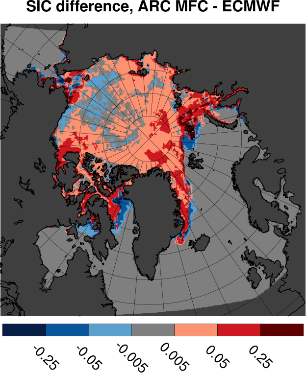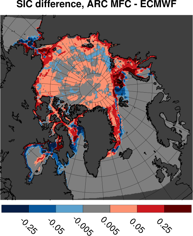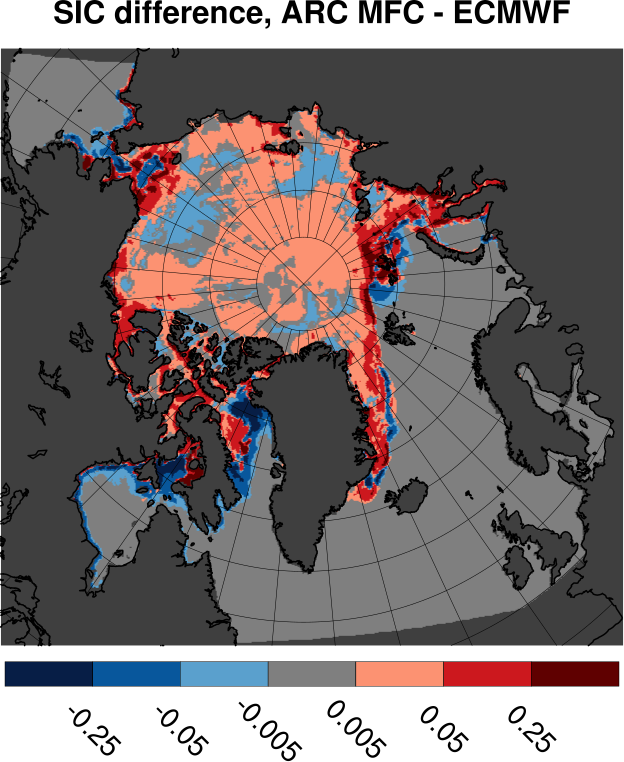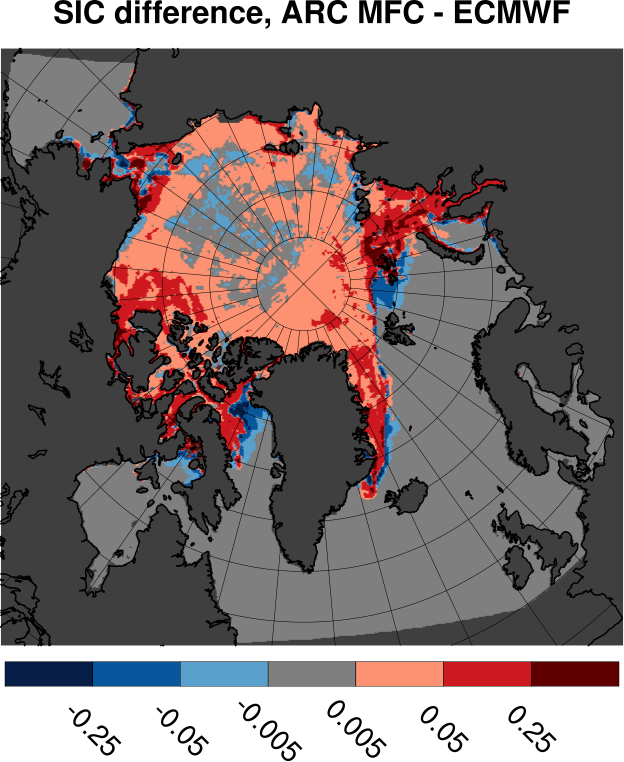 Tabulated values are computed by subtracting ECMWF results from ARC MFC results. All values are in units of Mkm2. Bottom row shows results for differences in sea ice area. Other rows shows area where the sea ice concentration differences fall inside the range given by the span in the leftmost column.