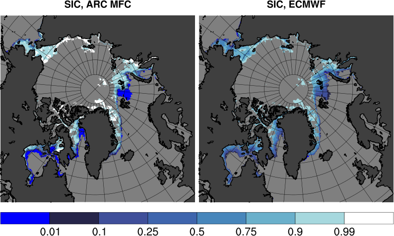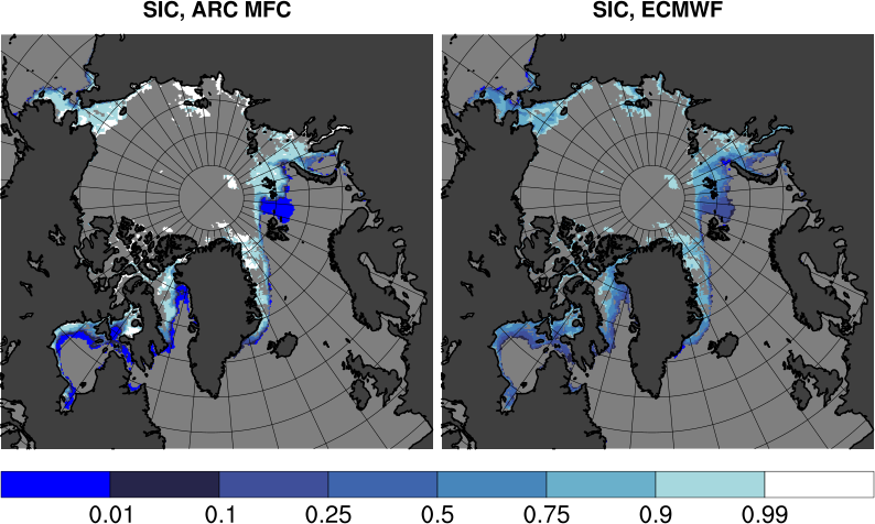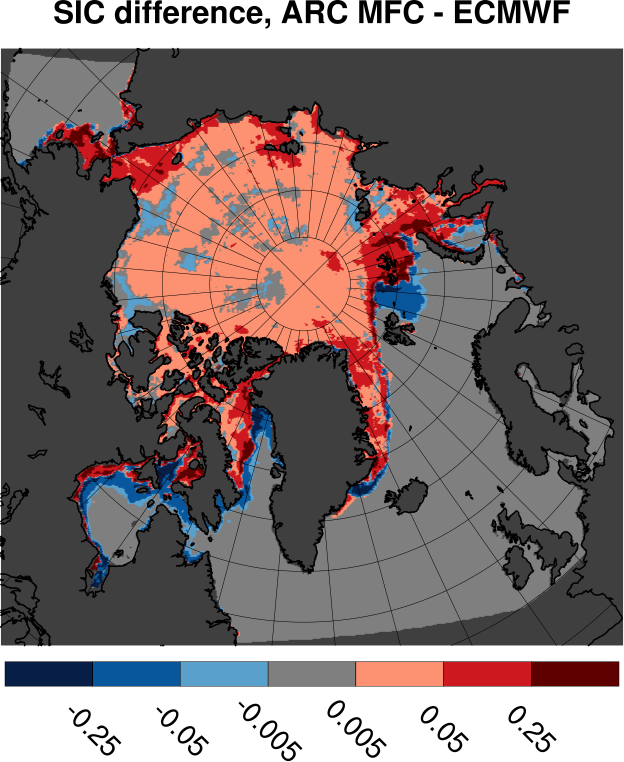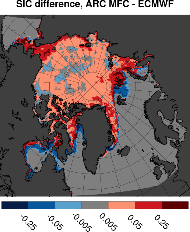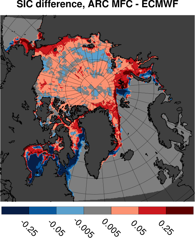 Tabulated values are computed by subtracting ECMWF results from ARC MFC results. All values are in units of Mkm2. Bottom row shows results for differences in sea ice area. Other rows shows area where the sea ice concentration differences fall inside the range given by the span in the leftmost column.