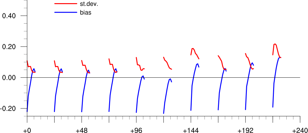 Displayed below are evolution of validation metrics averaged over all tide gauge stations, as functions of forecast lead time (in hours).