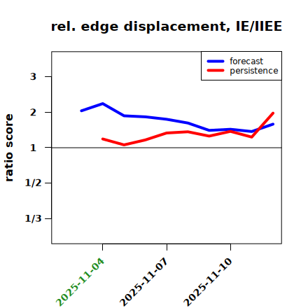 | Observations in blue, model forecast in grey, persistence in brown | |