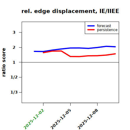 | Observations in blue, model forecast in grey, persistence in brown | |